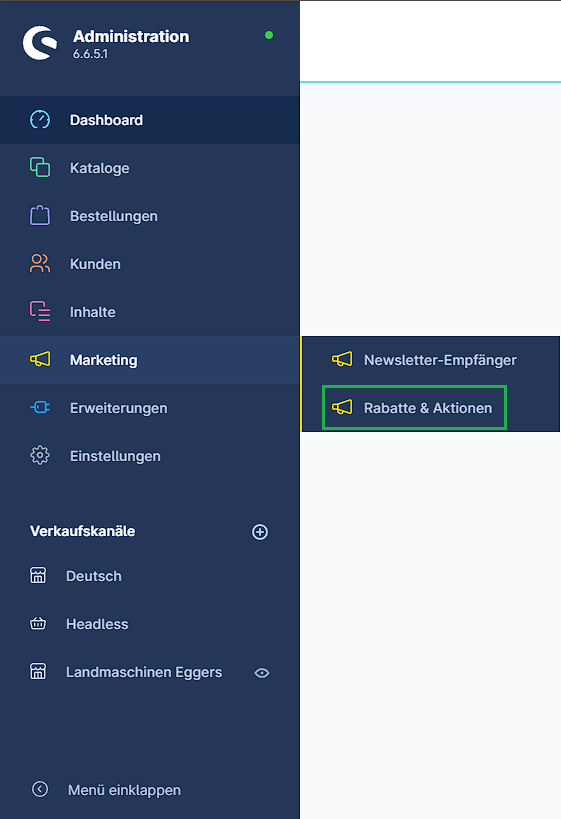 1. Navigiere zu Marketing -> Rabatte & Aktionen