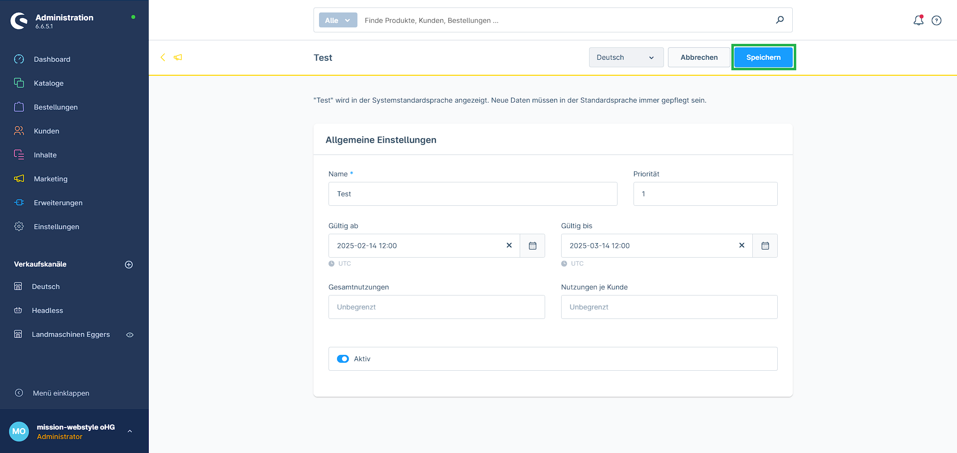 3. Informationen unter Allgemeine Einstellungen eintragen. (Name, Priorität, Gültig ab/bis, Nutzungen, Aktiv)