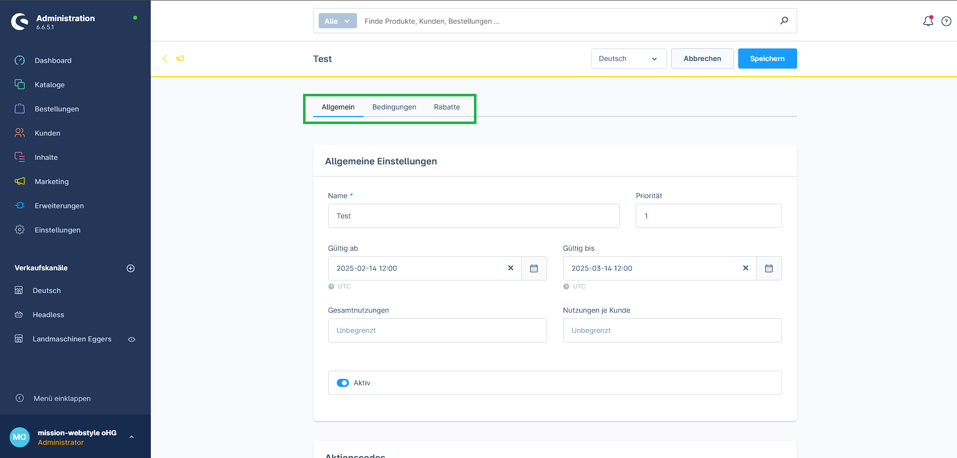 4. Nach dem ersten Speichern tauchen zwei weitere Tabs neben „Allgemein“ auf: Bedingungen und Rabatte.