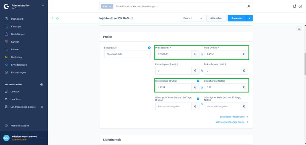 3. Unter „Allgemein“ ein wenig runterscrollen zu dem Punkt „Preise“. Der ursprüngliche unrabattierte Preis muss unter Streichpreis eingetragen werden. Der neue rabattierte Preis muss unter Preis eingetragen werden.