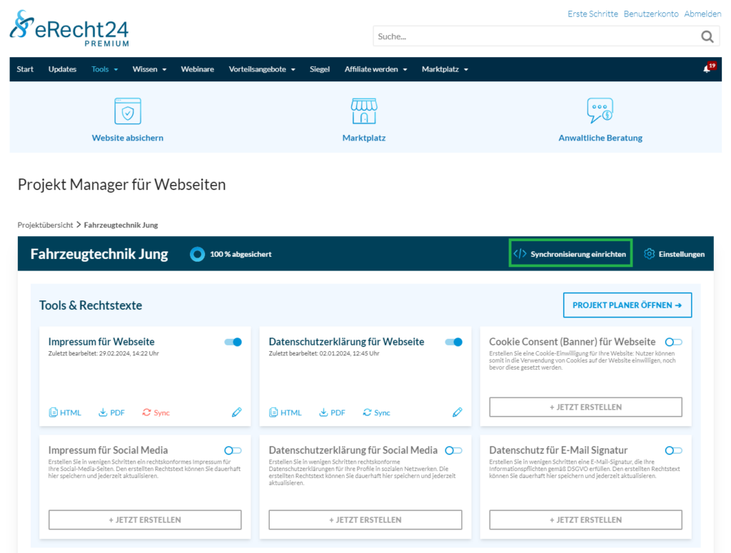 1. Projekt in eRecht24 öffnen und Synchronisierung einrichten klicken.