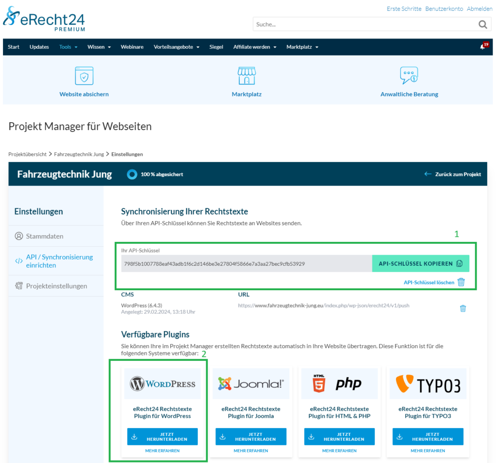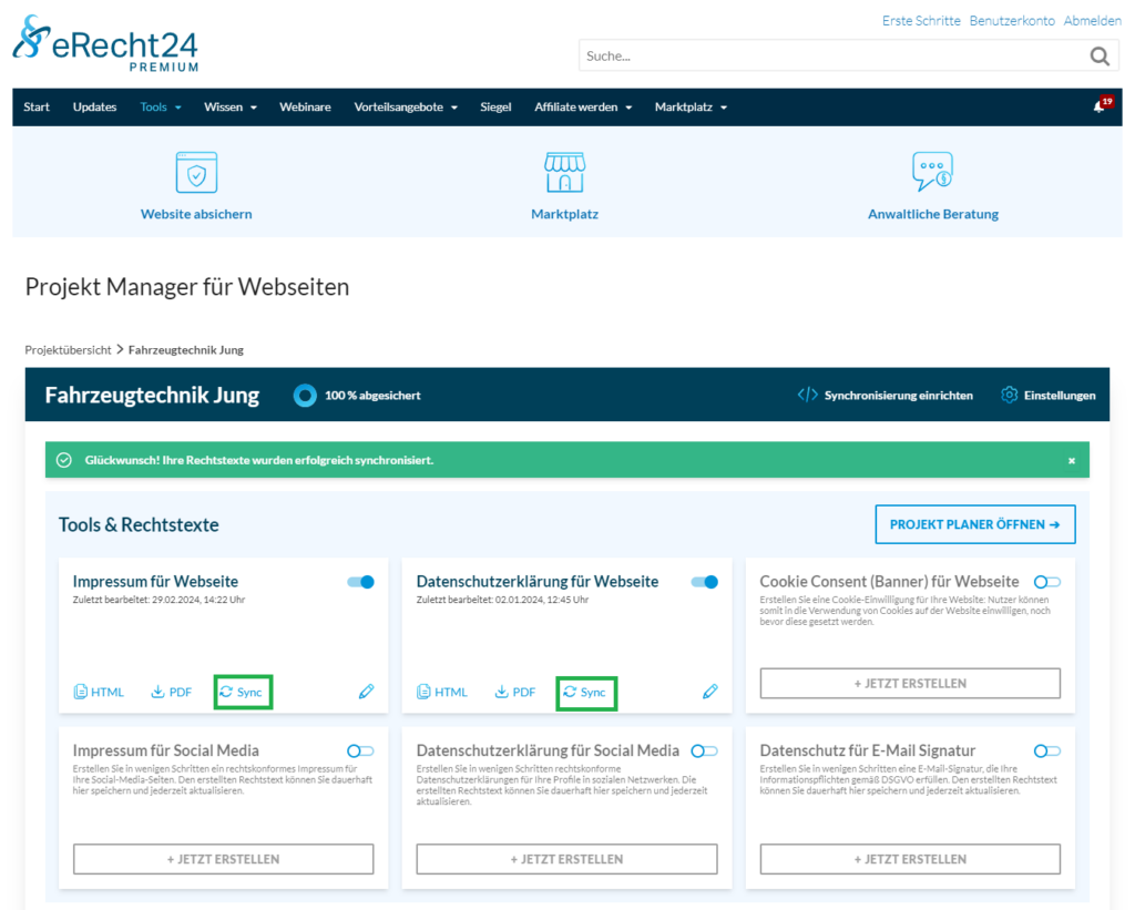 Bei eRecht24 einloggen, Projekt auswählen und bei Impressum und Datenschutz auf „Sync“ klicken. Ggf. muss sich noch einmal durch die Einstellungen der Texte geklickt werden.