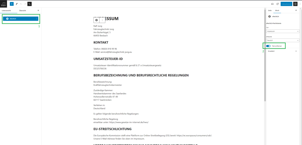 5. Auf der Impressum- und Datenschutzseite einen eRecht24-Block einfügen (1) und Impressum oder Datenschutz bei „Typ“ auswählen und „Titel entfernen“ anhaken (2).