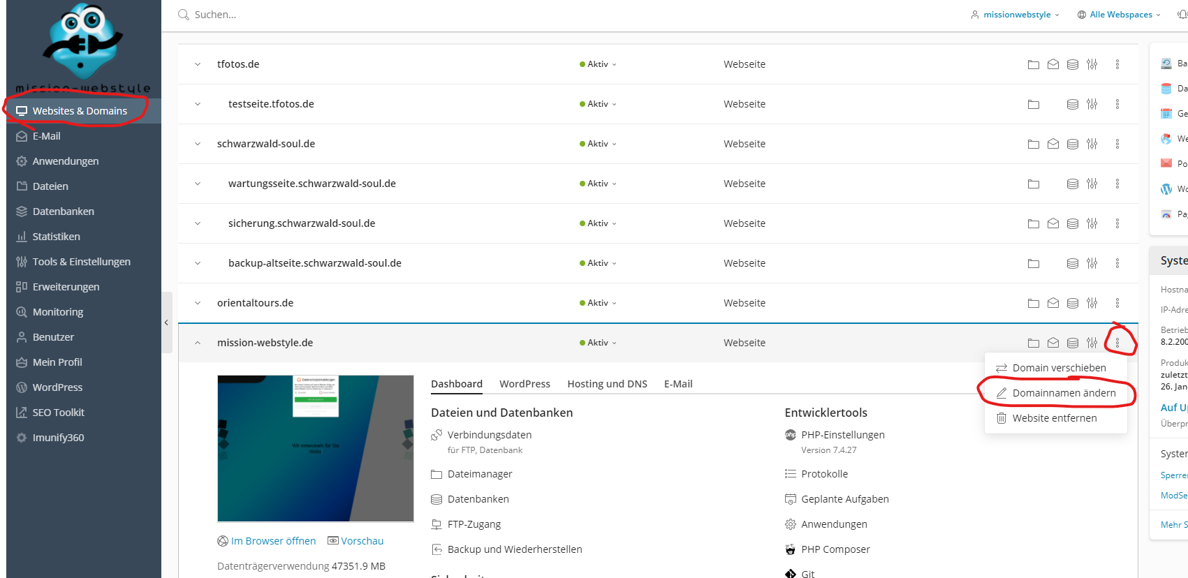 - Zunächst einmal Pfad + Domainname der Installation ändern (Schritt 1 und 2).