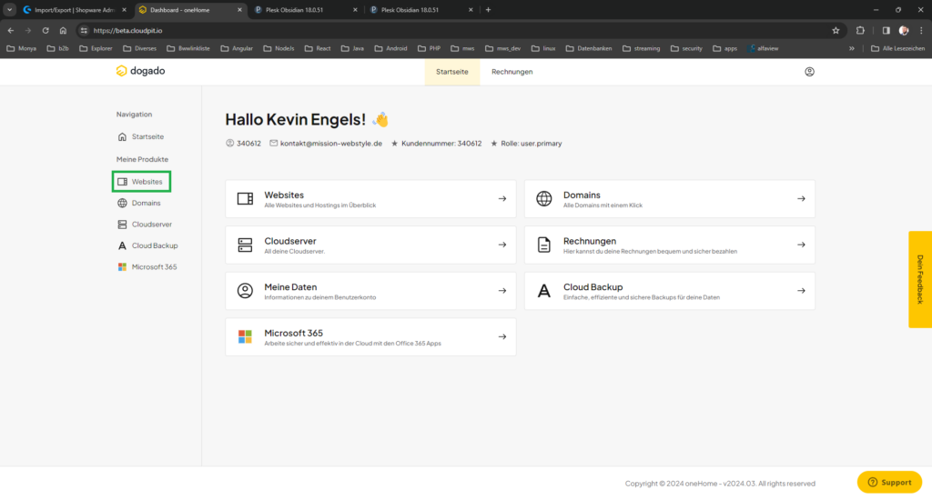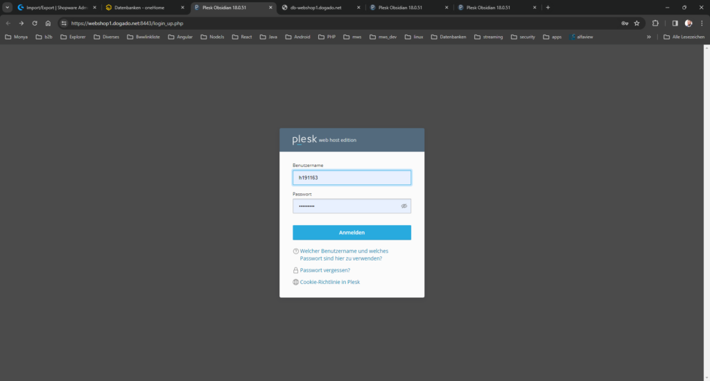 - Es öffnet sich die Plesk des Shopware Paketes: https://webshop1.dogado.net:8443/login_up.php?