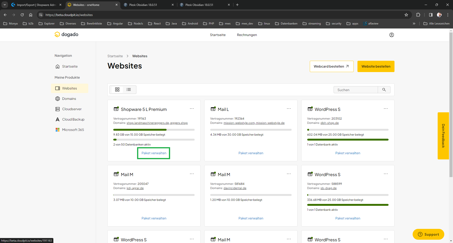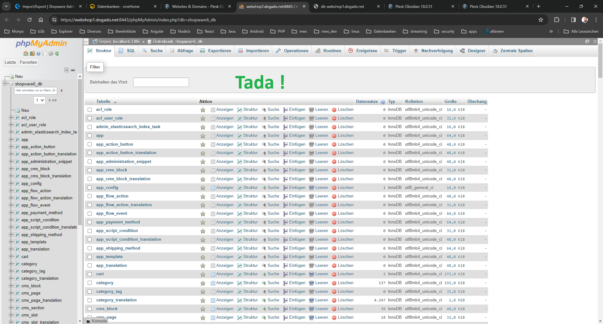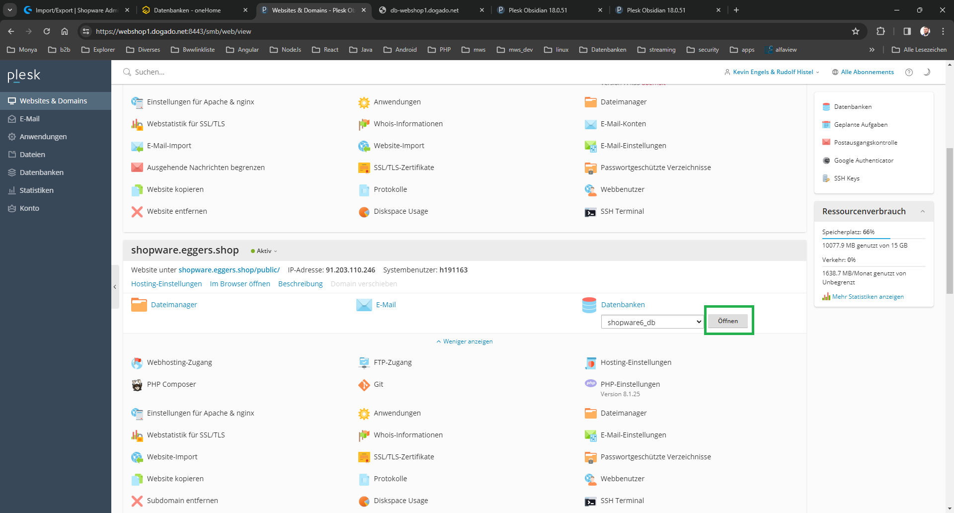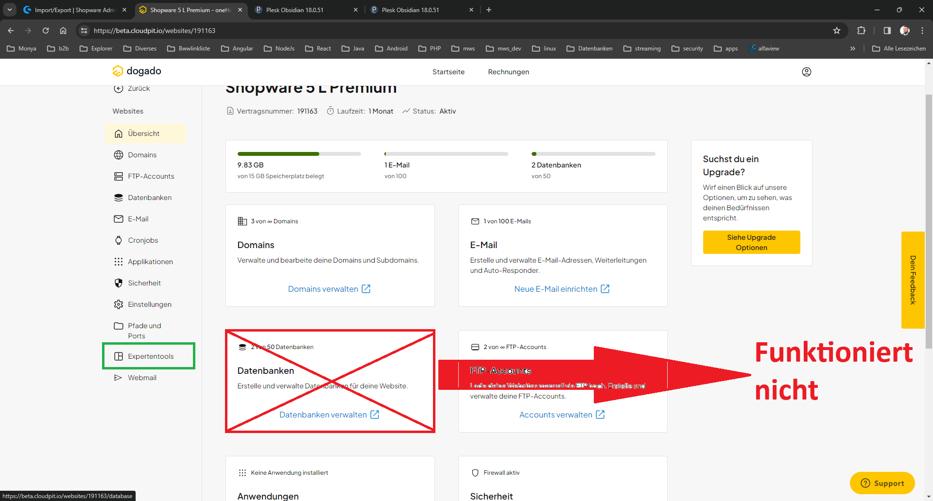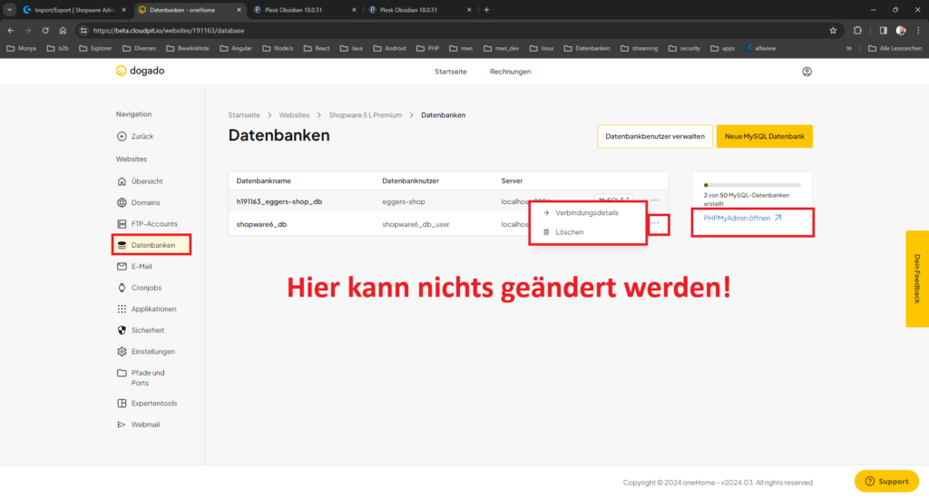 Der angedachte intuitive Weg funktioniert nicht. Es muss die das Shopware Paket ausgewählt werden und dann via „Expertentools“ auf das Plesk navigiert werden um dort dann wie gewohnt die Datenbank zu öffnen. Kann auch daran liegen das 2 Datenbanken hinterlegt sind. Für WordPress Pakete „Datenbank verwalten->PhpMyAdmin öffnen“ genutzt werden, sollten die Daten bereits bekannt sein.