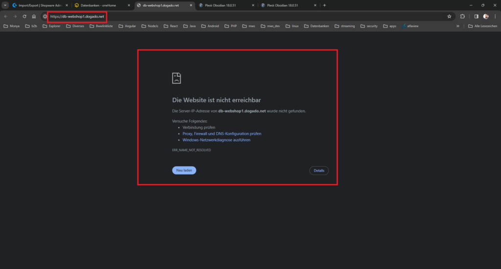 Die URL die aufgerufen wird ist https://db-webshop1.dogado.net/ ist aber falsch. Da PhpMyAdmin nur localhost läuft und nur aus Plesk heraus die Anmeldung statt finden kann. Die eigentliche Domain die aufgerufen werden sollte ist: https://webshop1.dogado.net:8443/phpMyAdmin/i